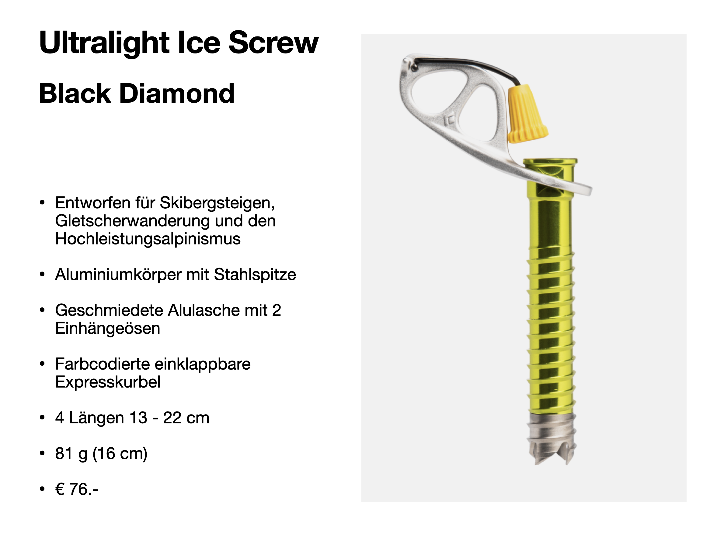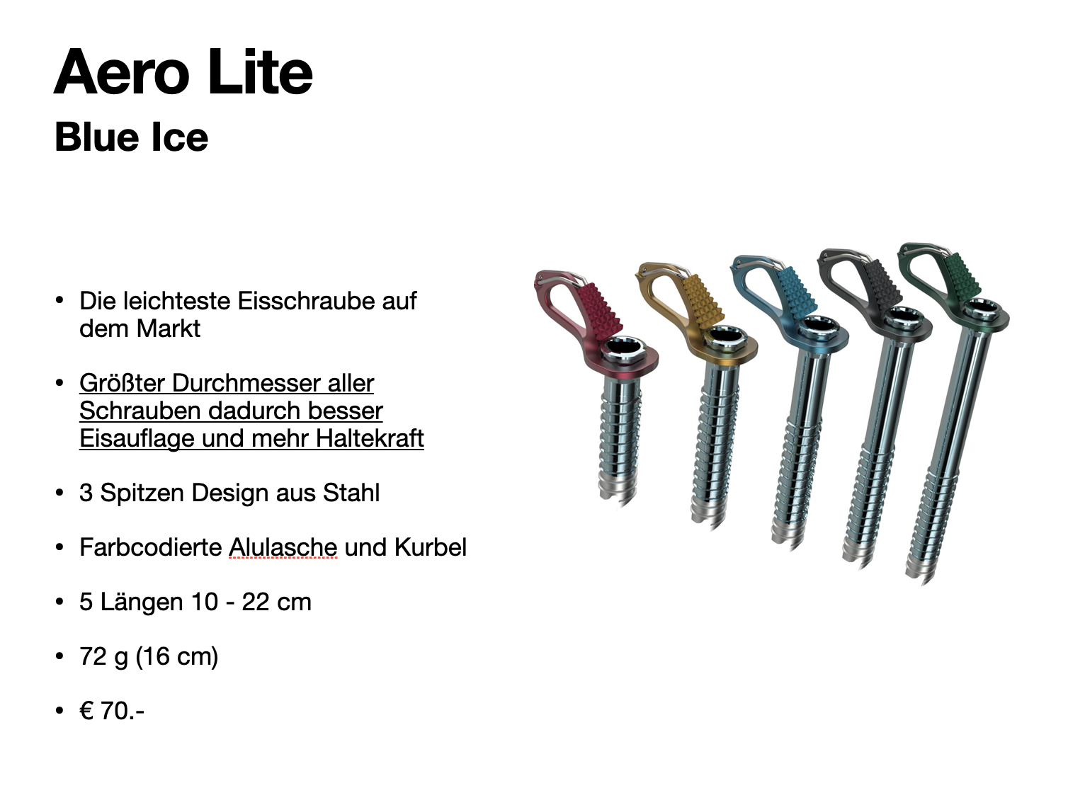 Mit Hebel und Schutz über den Schneiden sollten alle ausgestattet sein. 13 -22 cm ist für den Sommereinsatz optimal. Beim Wasserfallklettern muss das Eis möglichst trocken sein, damit die Aluschraube beißt. Deshalb müssen im Winter immer auch Stahlschrauben dabei sein.