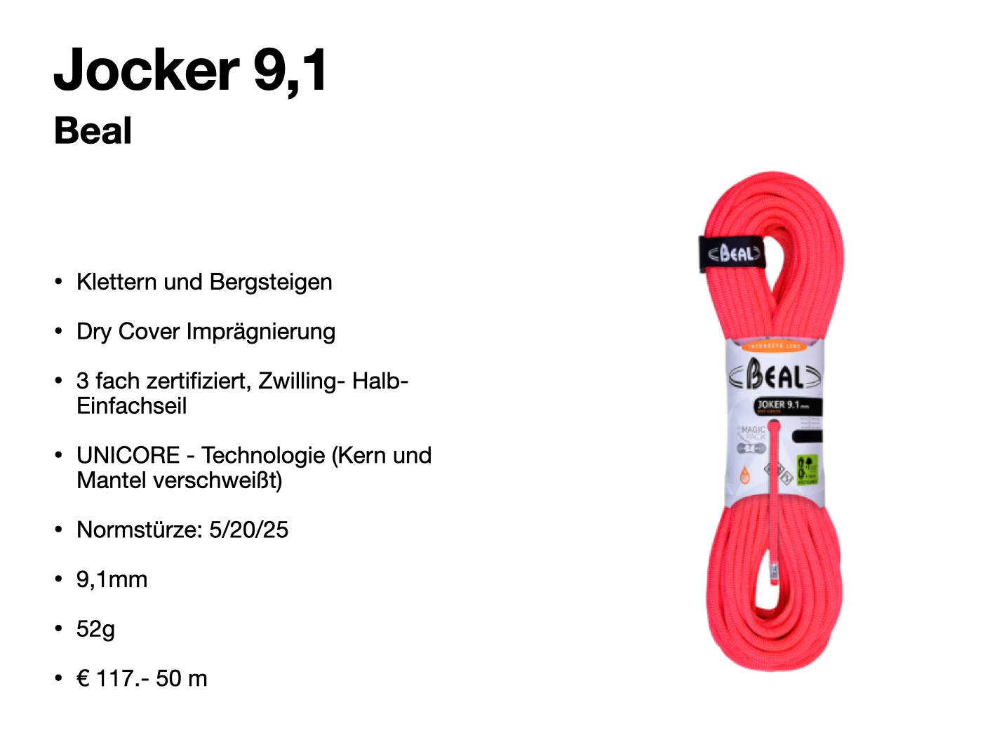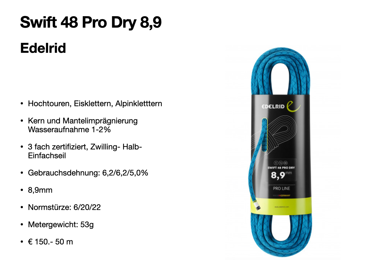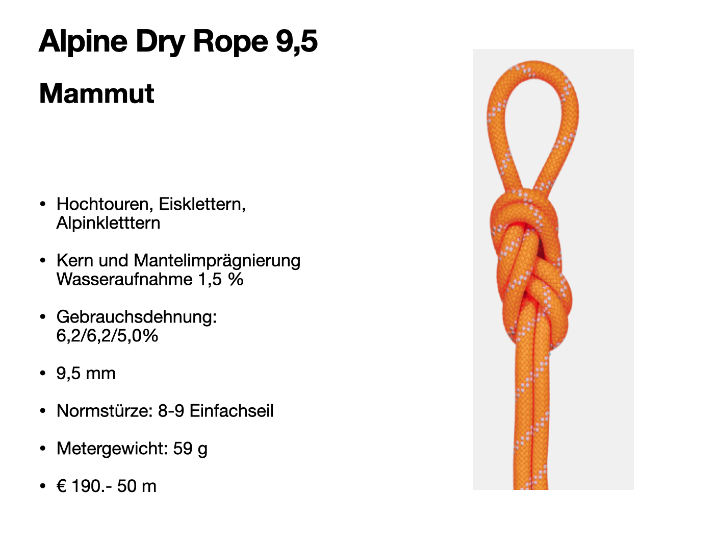 Eigenschaften Hochtourenseil: Mehrfachzertifiziert, imprägniert, Durchmesser 8,9 -9,5 mm, Gewicht 52- 71g/m, gute Mantelfestigkeit.