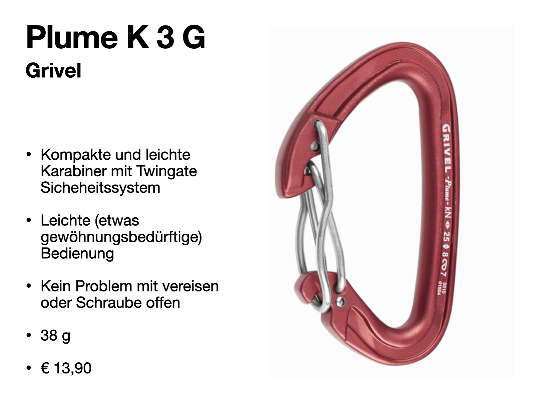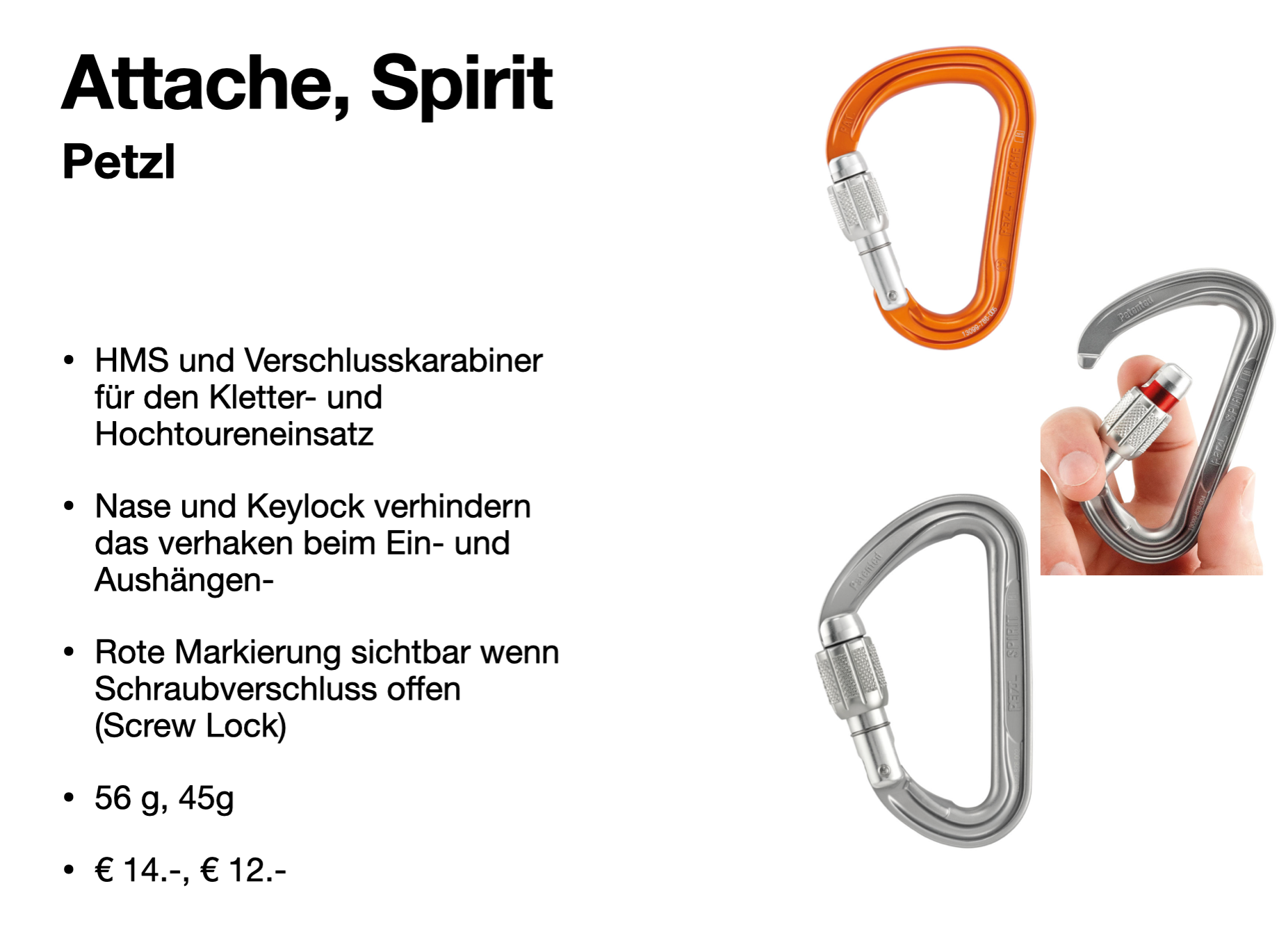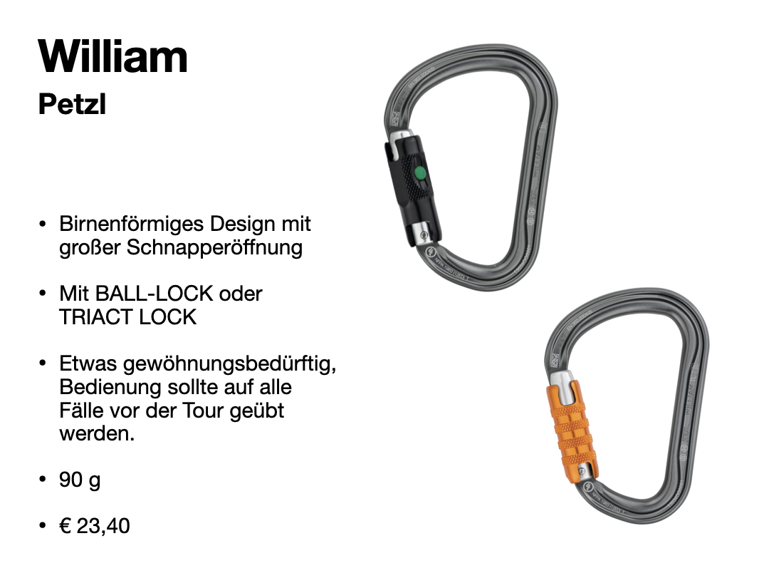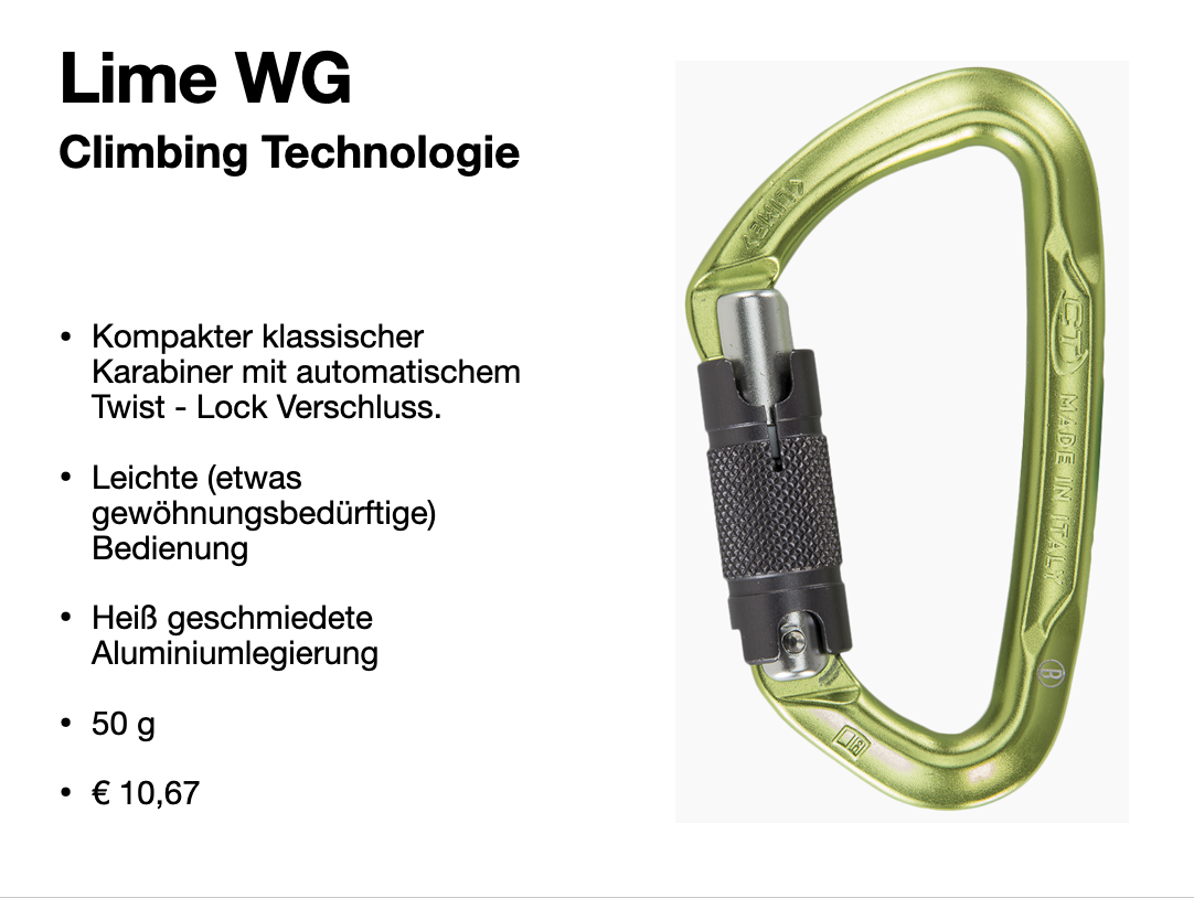 Mit der zusätzlichen Schraube wird der Karabiner vor ungewollten öffnen geschützt. Bewusstes zuschrauben (meist ⅛ Drehung zurück) und die Kontrolle ist notwendig.