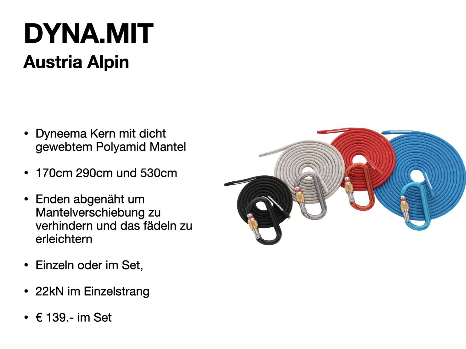 - Reepschnüre ca. 1,5m, 3m, 5m bevorzugt mit Dyneema Kern (Austria Alpin DYNA.MIT)