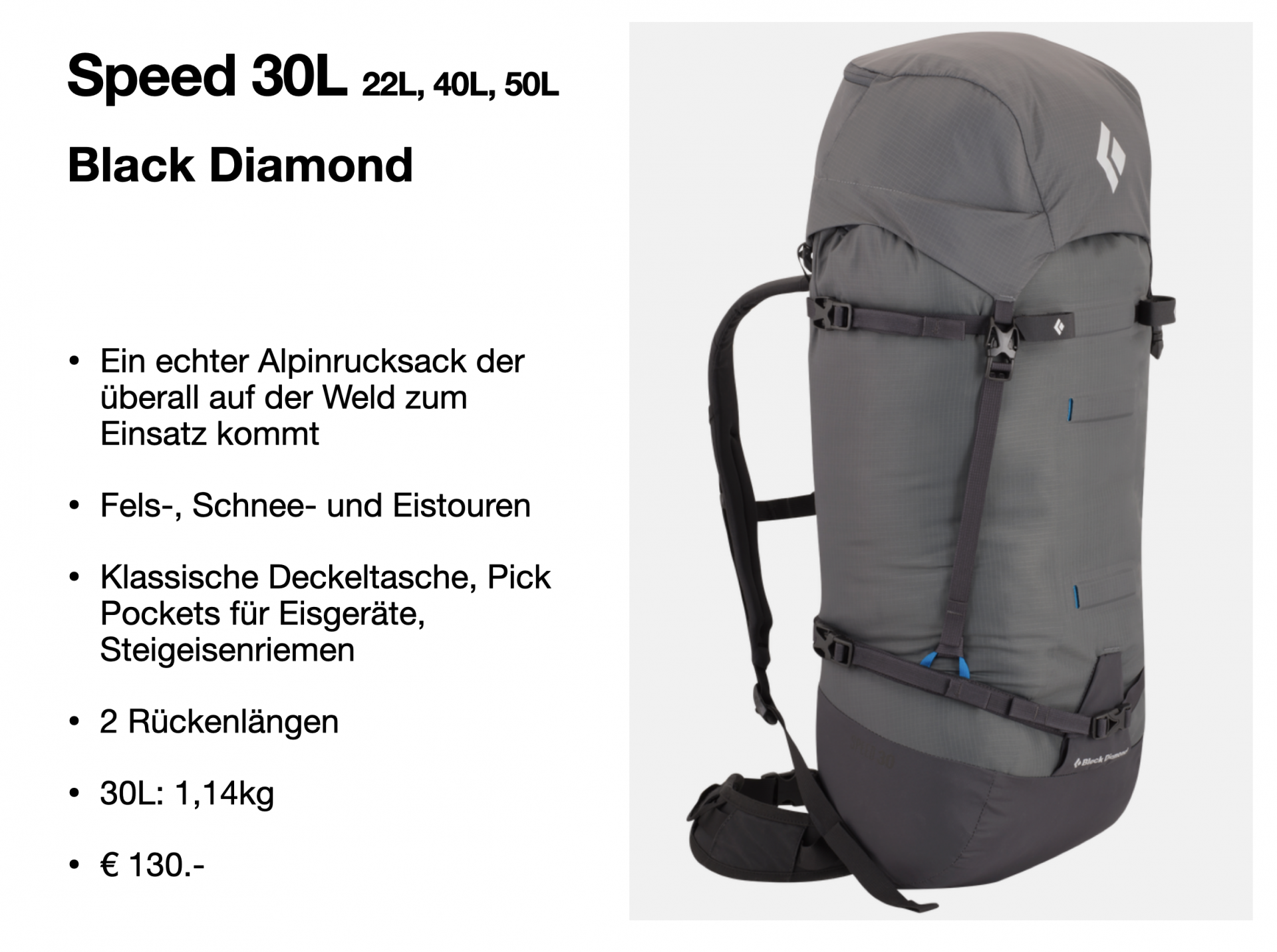 - Kletterrucksack mit Pickelbefestigung (30 – 40 Liter)