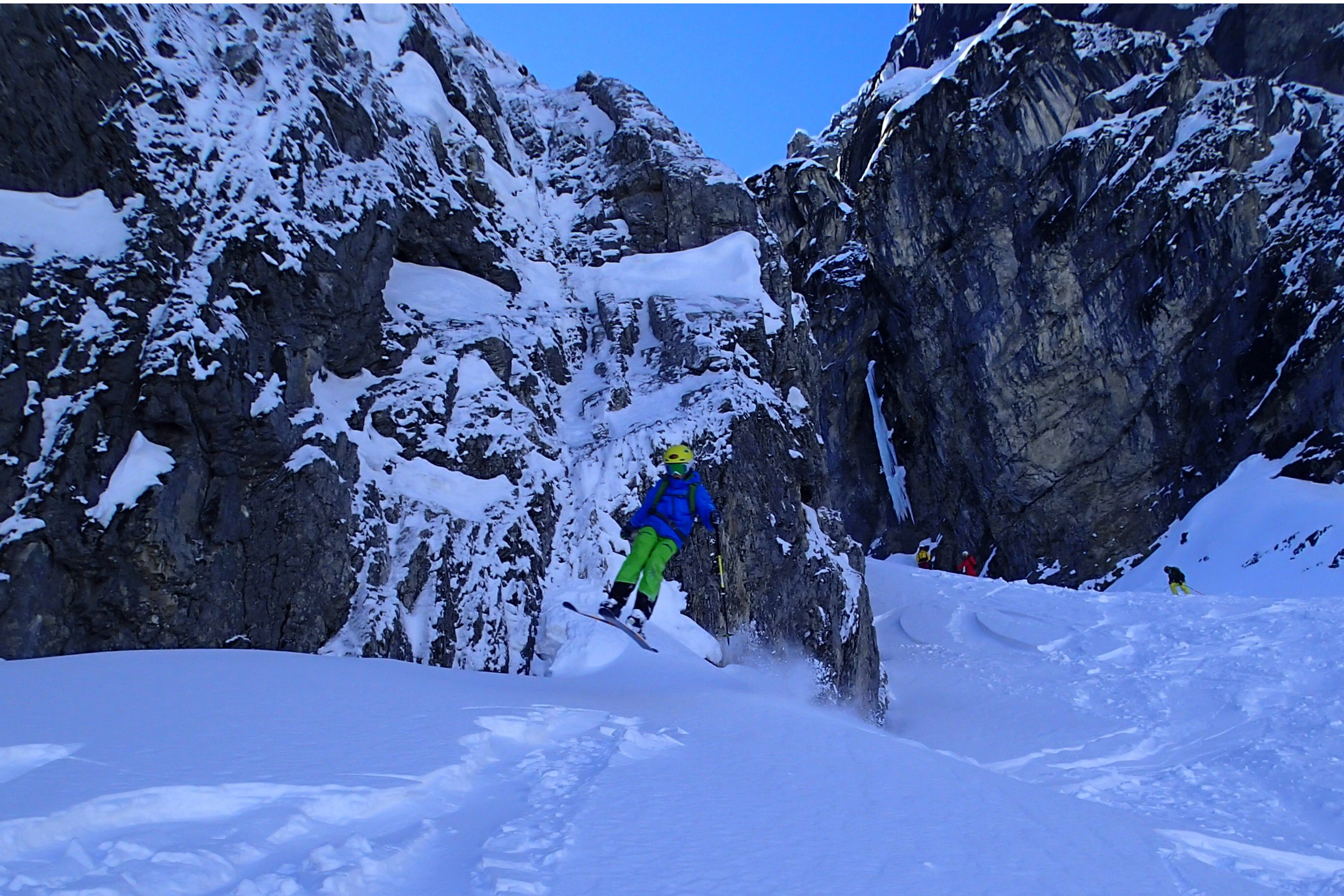 Ausfahrt aus der ersten Engstelle im Graben. Diese Variante ist nur bei sehr sicheren Verhältnissen mit ausreichen Schnee fahrbar. Achtung bei wenig Schnee Sackgasse!!!!! Beschreibung Outdoor Guide Engelberg.