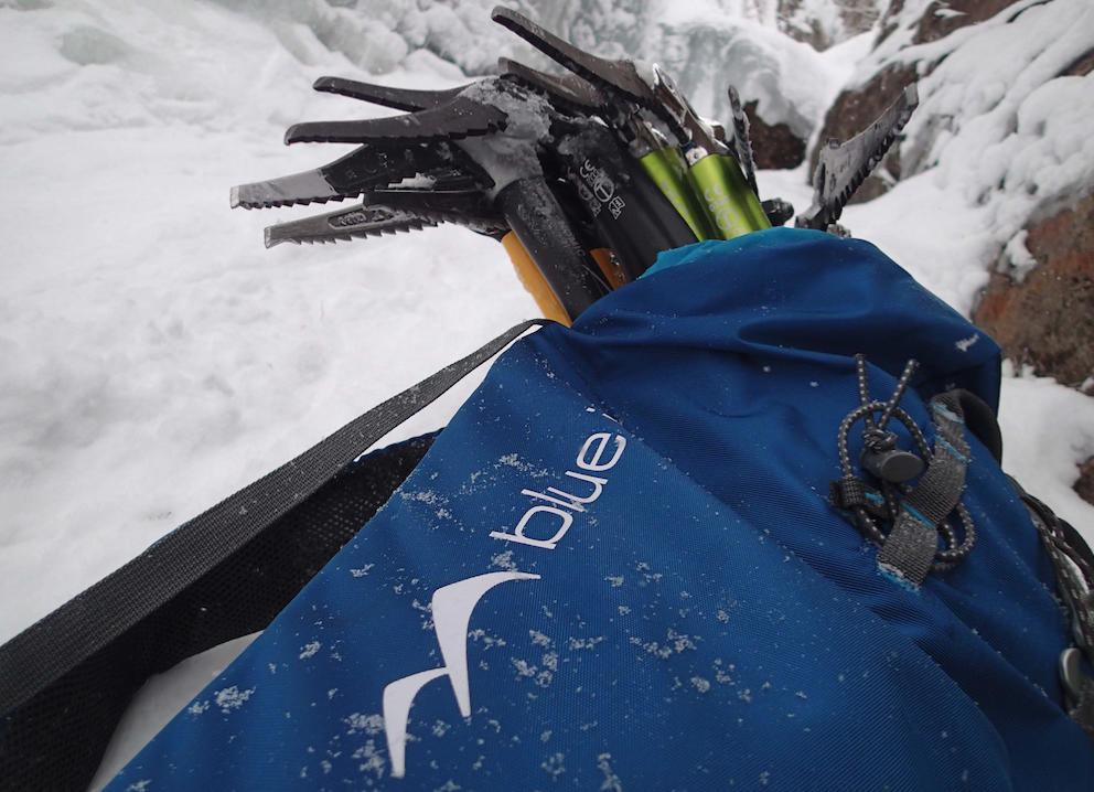 * Helmet holder, dual ice tool holders, folded webbing allowing shoulder straps to double as gear loops