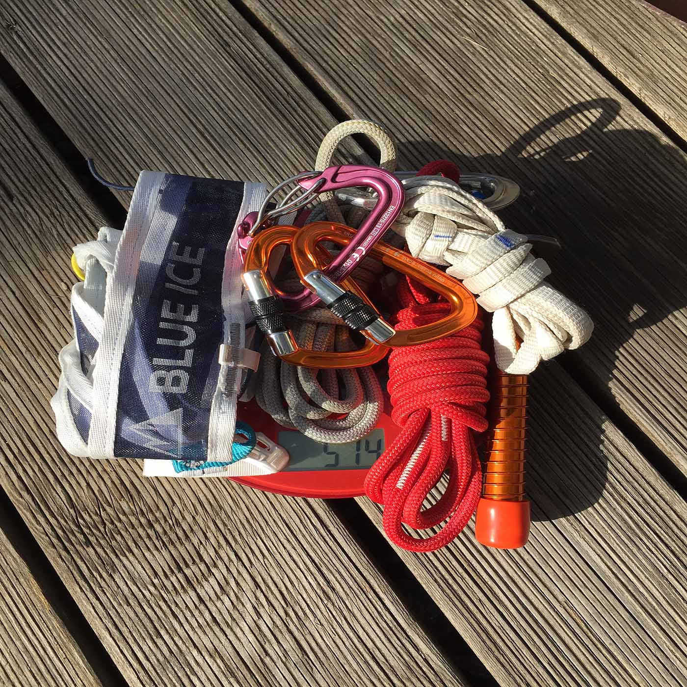 Pickel, Steigeisen, eine zweite Eisschraube und der eine oder andere Karabiner findet sich dann doch neben der Rucksackapotheke und dem Biwaksack.
