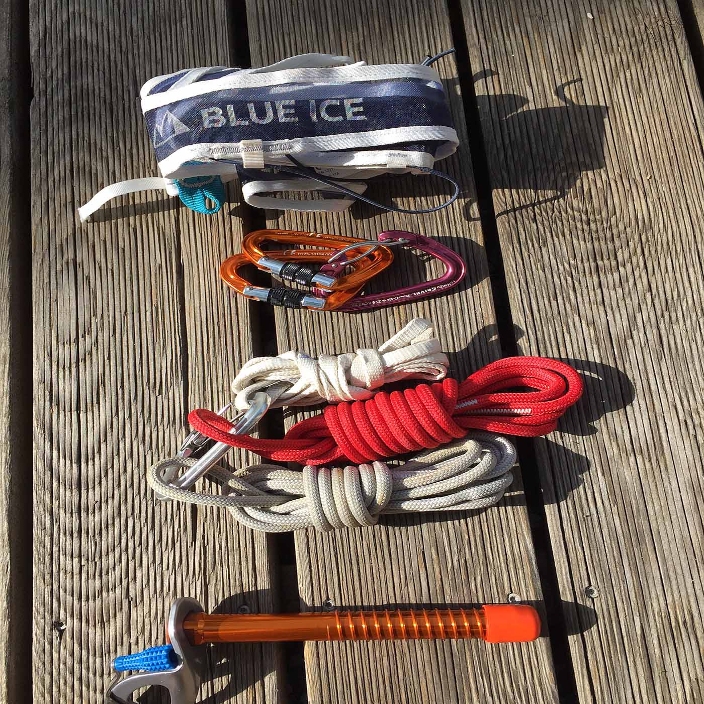 Choucas Lite von Blue Ice, Plume K3G von Grivel, Dyneema Reepschnur von AustriaAlpin, PurAnneau von Petzl, Petzl Laser Speed