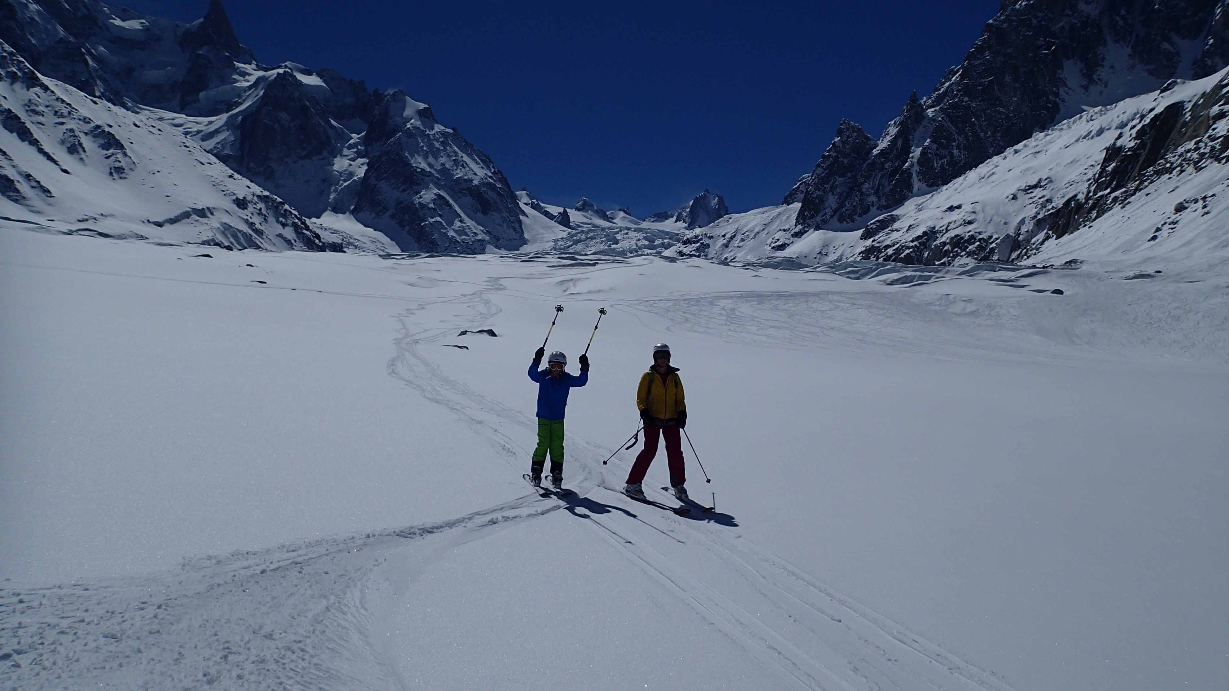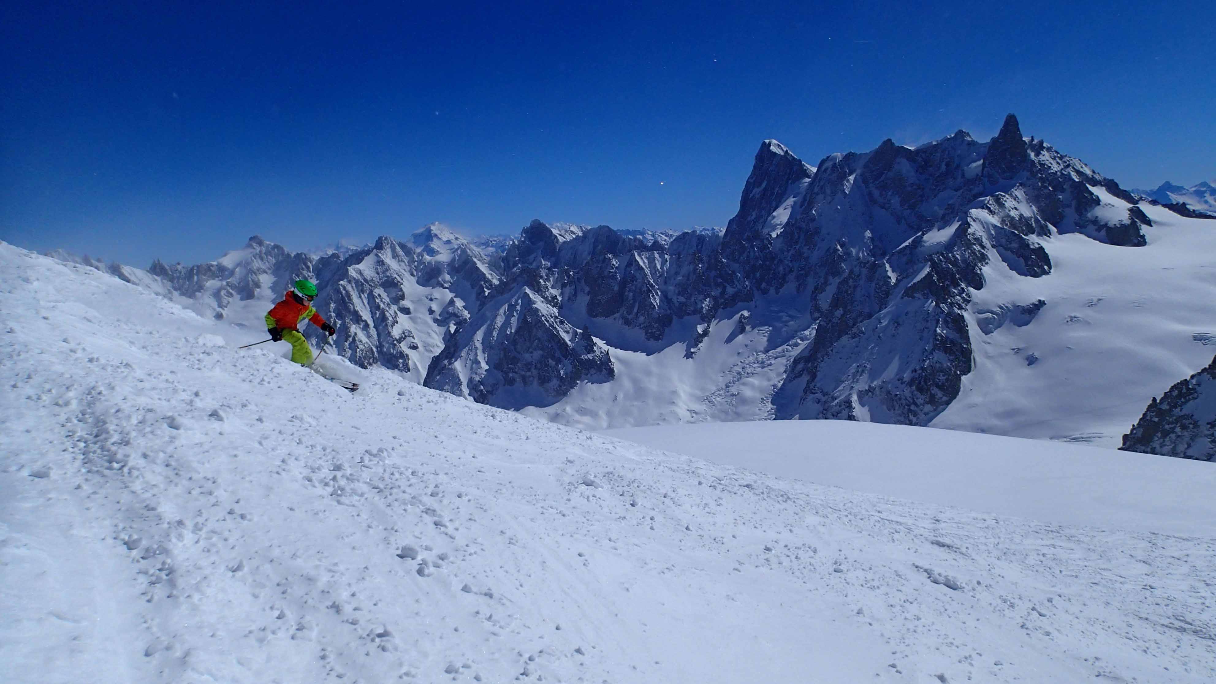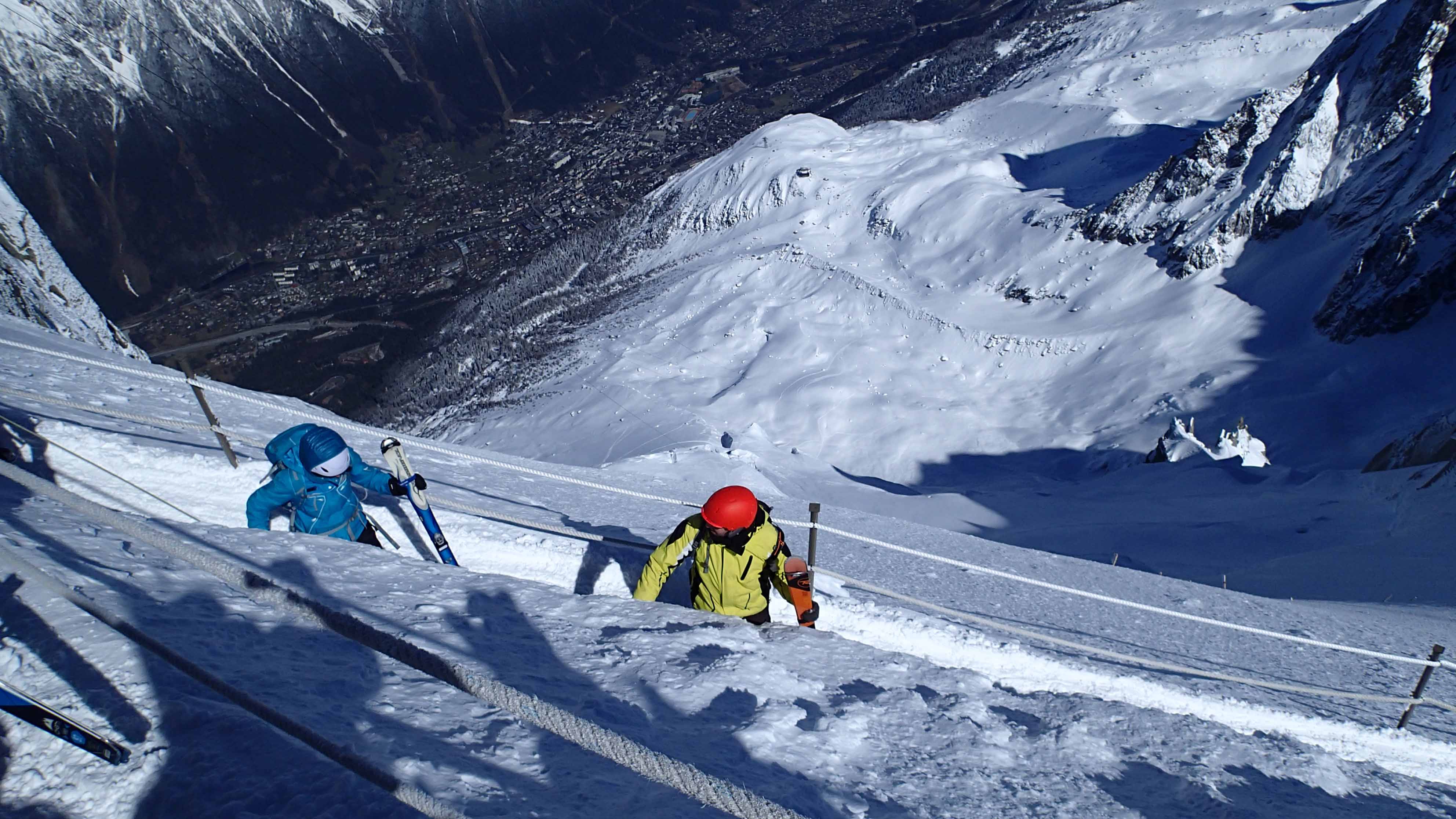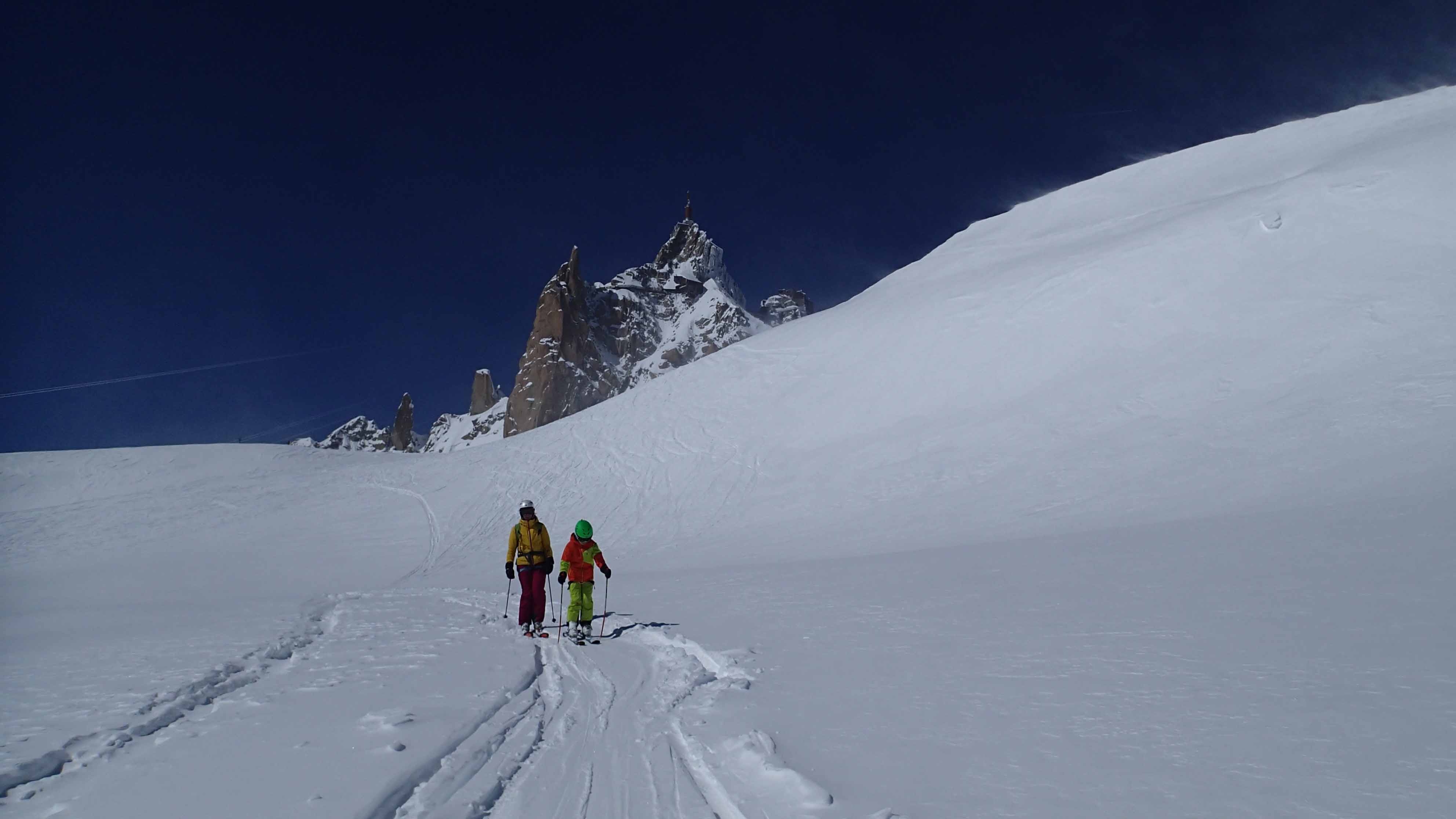 Ausrüstung: Die Abfahrt durch das Valle Blanche ist, wenn auch oft stark verspürt vergletschertes spaltenreiches Gelände. Hochtourenausrüstung ist unbedingt erforderlich. Zahlreiche Variante führen hinunter nach Montenvers.
