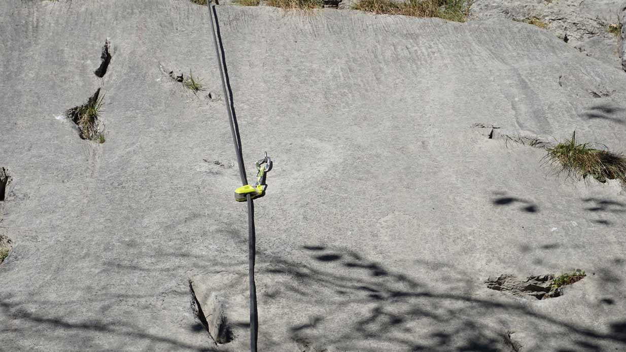 Ohm in der ersten Zwischensicherung unbelastet. Seil läuft ganz entspannt durch das Ohm, im Vorstieg wenig bis keine zusätzliche Reibung spürbar.